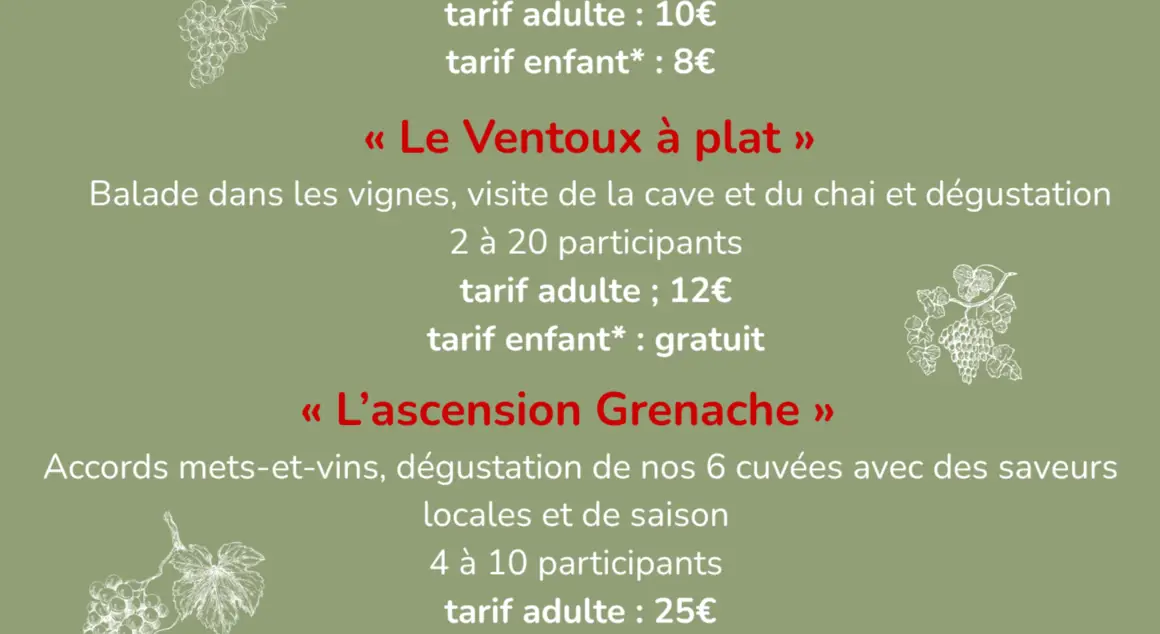 Autres animations proposées : ==>Ventoux Express - visite cave et jeu senteurs ==>Ventoux à plat - balade ==>Ascension Grenache - accords mets-vins ==> Le maillot à pois des saveurs - balade et accords ==> Le peloton s'amuse - jeu d'assemblage ==> privatisation sur demande